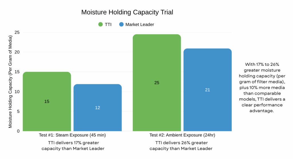 Drei Tage lang wurden TTI-Trockenmittelentlüfter im Vergleich zu einem Konkurrenzprodukt eines führenden Industrieherstellers getestet. Jede Einheit war acht Stunden pro Tag in Betrieb, was einer Gesamtlaufzeit von 24 Stunden entspricht. Die Leistung wurde durch Vergleich der nach der gesamten Testdauer auf dem Silicagel adsorbierten H2O-Menge gemessen.