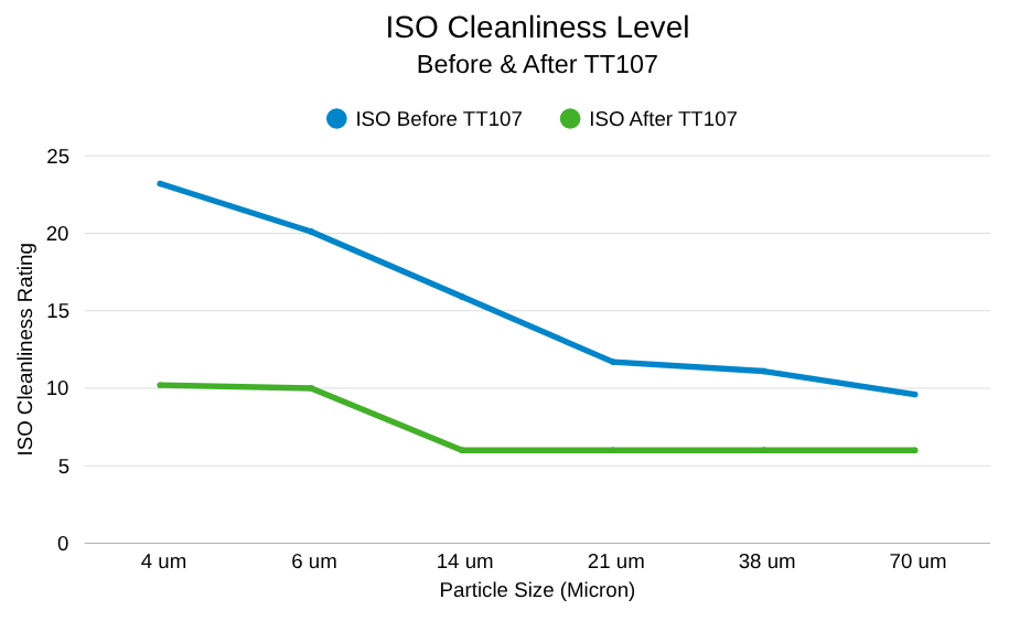 Von Beginn an wurde das System durch sorgfältige Tests validiert. Die Anlage spülte die Leitungen, prüfte auf Lecks und überprüfte die Partikelanzahl sowohl am Pumpenausgang als auch am Filtergehäuseausgang. Der anfängliche ISO-Code von 23/20/15 am Pumpenausgang (vor der Filtration) bestätigte das Risiko eines Systemrisikos. Mit Hilfe von TTI verbesserte sich die ISO-Reinheit jedoch in einem einzigen Durchgang auf 10/10/6.